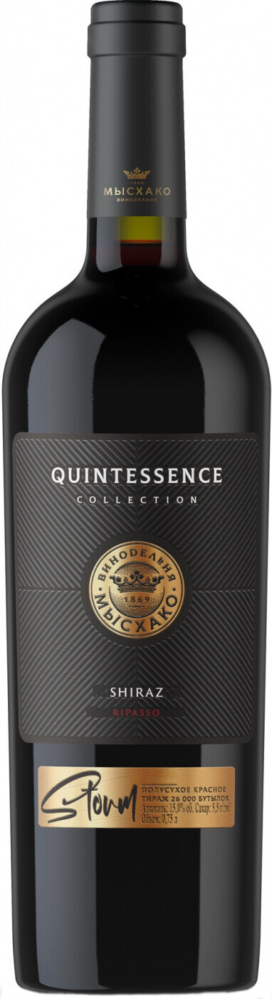 Myskhako, Quintessence, Storm Shiraz Ripasso — изысканное красное полусухое вино из винограда сорта Шираз, который выращивается в защищенном географическом регионе Кубань. Вино производится по технологии "ripasso", при которой сусло проходит вторичную ферментацию с использованием подвяленного винограда. Выжимки провоцируют повторное брожение. Этот процесс повышает уровень алкоголя, улучшает содержание и структуру вина, повышает долговечность, а также развивает новые ароматы, которые создают интересный и сложный букет. Вино рекомендуется подавать к тушеному, жареному или приготовленному на гриле красному мясу, дичи и зрелым сырам. "Квинтэссенция" Шторм Шираз Рипассо выпускается в ограниченном количестве.