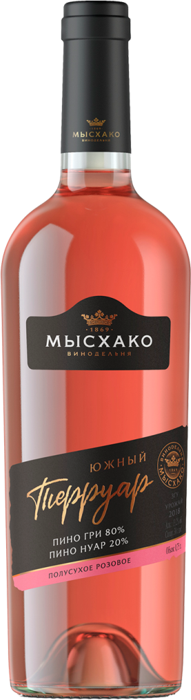 Мысхако, Южный Терруар" Розовое полусухое — мягкое и гармоничное вино, изготовленное из винограда сортов Пино Гри и Пино Нуар, выращенного в защищенном географическом регионе Кубань. Чтобы сохранить в вине достаточный уровень природного сахара, виноделы используют прием резкого снижения температуры во время ферментации. Розовое полусухое вино Myskhako, "Yuzhnyj Terruar" Rose Semi-Dry прекрасно сочетается с легкими овощными закусками, рыбой, дарами моря, сырами, десертами и фруктами.
