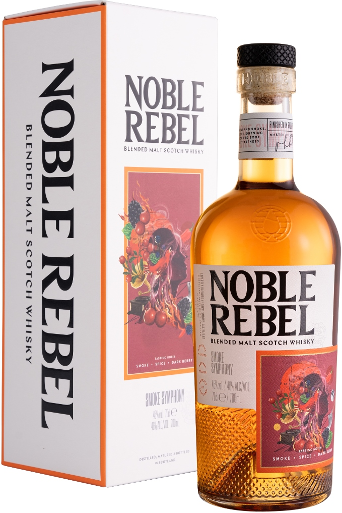 Noble Rebel, Smoke Symphony, Blended Malt — далек от повседневного драма, это искусно купажированный солодовый виски, наполненный дымным торфом и нотками перца чили. Довыдержка в бочках из-под красного испанского вина из Риохи добавляет его дымному сердцу слои терпкости и насыщенных темных ягод. Дистилляция, купажирование и выдержка проводятся под опытным взглядом независимого мастера-купажа Майкла Генри. Виски выдерживается не менее 3-х лет в дубовых бочках. Виски бутилируется при крепости 46%, без холодной фильтрации и окрашивания карамелью. Независимо от того, как употребляется "Нобл Ребел" Смоук Симфони, в чистом виде, со льдом или в классическом коктейле, этот виски обязательно удовлетворит даже самых взыскательных гурманов.