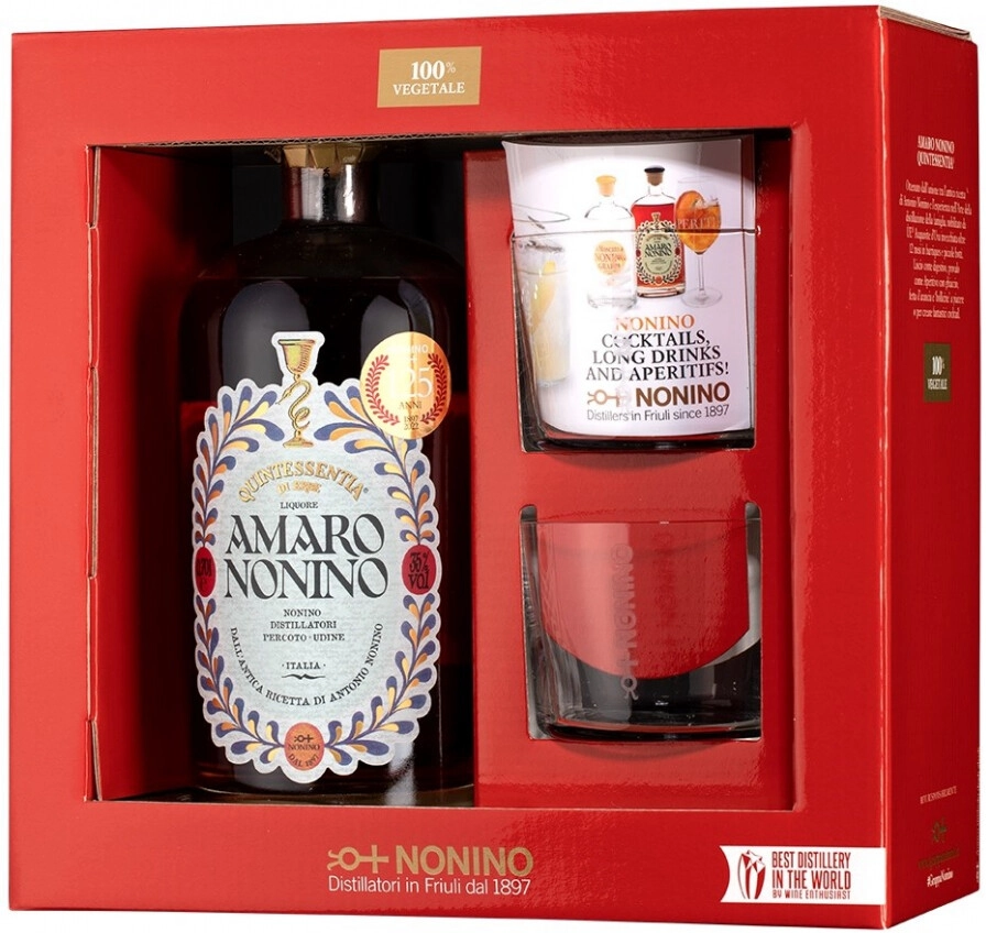 Нонино, Амаро Квинтэссенция, с двумя бокалами в п/у