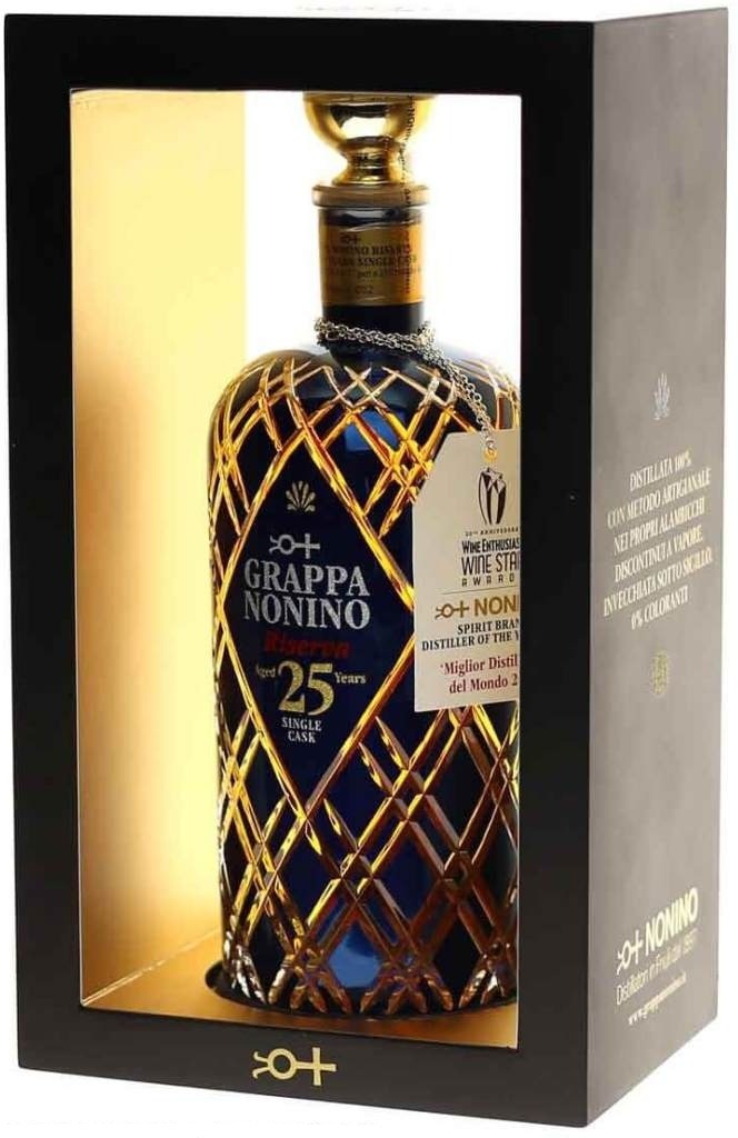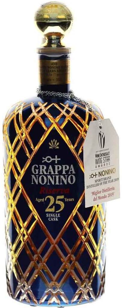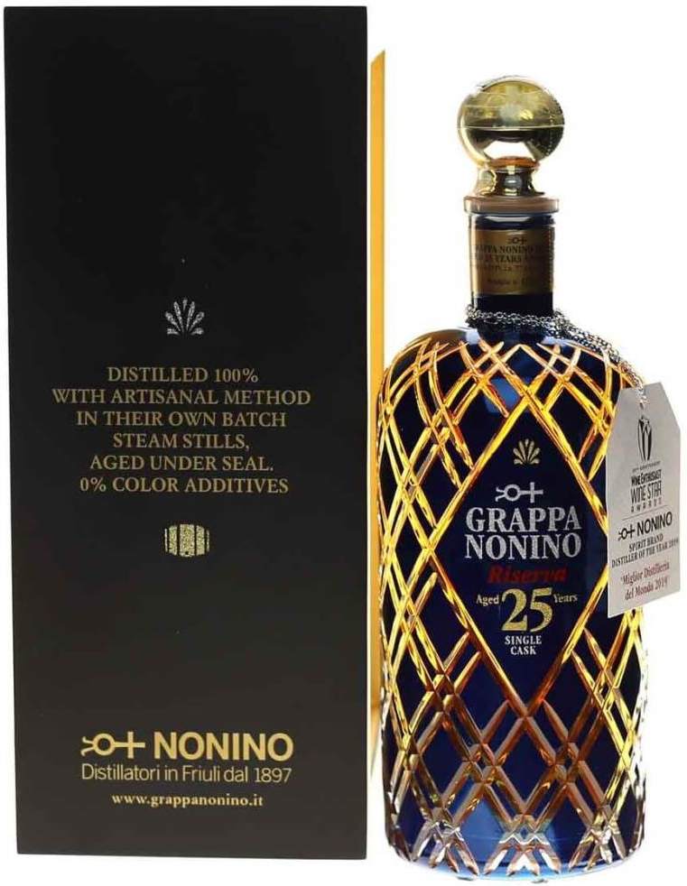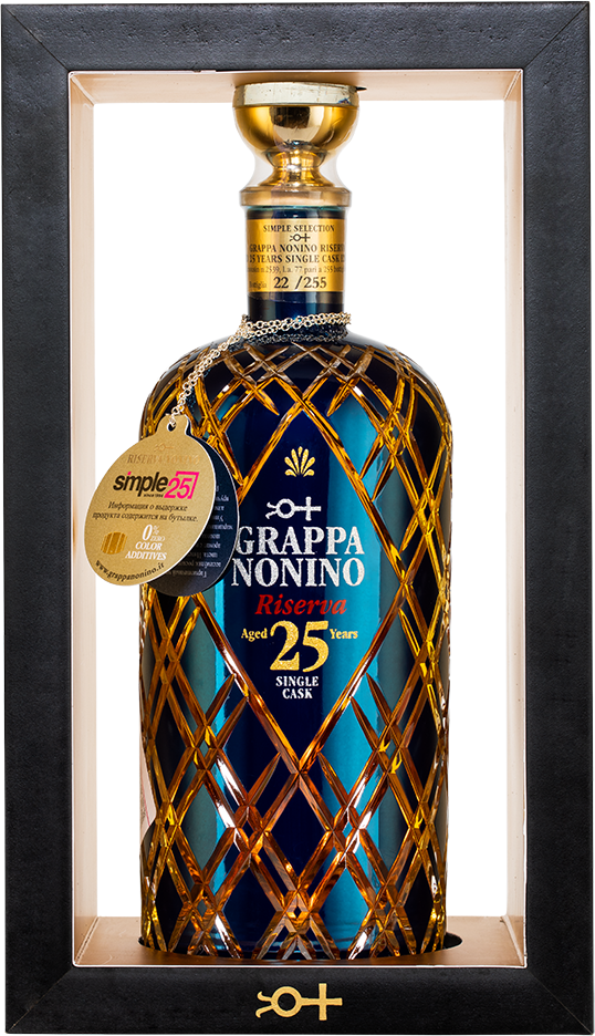 Nonino Riserva 25 Years Old — роскошная граппа, выпущенная в количестве всего 255 бутылок. Ферментация проходит в вакуумно запечатанных резервуарах из нержавеющей стали при контролируемой температуре, после чего сразу дистиллируется во избежание второй ферментации. Дистилляция проходит очень медленно, чтоб компоненты, отвечающие за аромат, смогли испариться с последующей конденсацией и сохранением благородных органолептических характеристик. Выдерживается граппа в течение 25 лет в бочке из Лимузенского дуба №2539. Граппа была разлита в бутылки, расписанные 24-каратным золотом на гранях и затонированные в голубой прусский цвет. На горлышке есть гравировка.