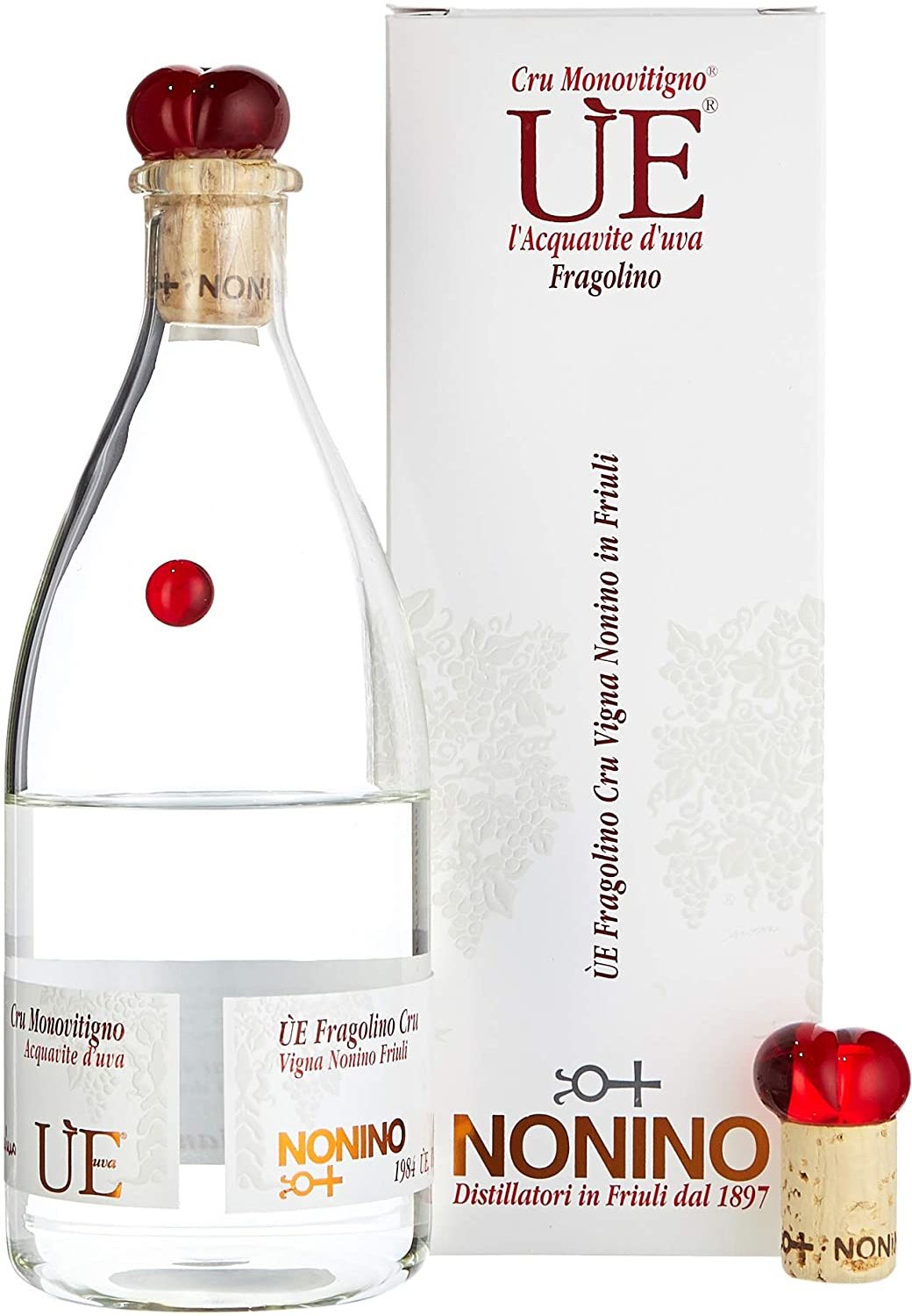 Nonino, UE Cru Fragolino – это замечательный виноградный дистиллят (аквавит), он производится из цельных ягод винограда сорта Фраголино. Для получения качественного продукта при изготовлении УЕ КРЮ Фраголино осуществляется слив конечного и начального дистиллята. Ферментация проводится в стальных вакуумных ёмкостях при строго контролируемой температуре. Выдержка проходит в стальных ёмкостях и больших стеклянных сосудах в течение 6-12 месяцев. Разливается этот уникальный напиток в элегантные бутылки, каждая из которых пронумерована. Пробка и маркер уровня сделаны из муранского стекла. Название напитка – «UE» на северо-итальянском диалекте означает «виноград».