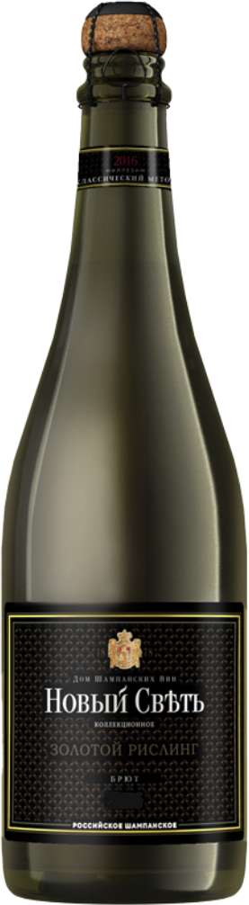 Новый Свет, Золотой Рислинг, Брют — коллекционное белое сухое игристое вино из отборного белого винограда сорта Рислинг Рейнский. Это изысканное моносортовое кюве ярко передает характеристику терруара западного Крыма. При производстве используется сок только первого отжима. Вино выдерживается на осадке более 36 месяцев в тоннелях конца XIX века при постоянной температуре +14 °С. Технологические операции — перекладка, ремюаж и дегоржаж — проводятся вручную. Новый Свет, Золотой Рислинг удостоено большого количества наград дегустационных конкурсов.