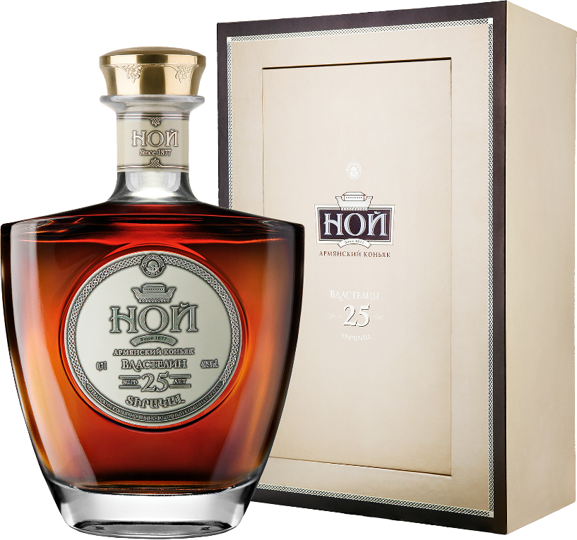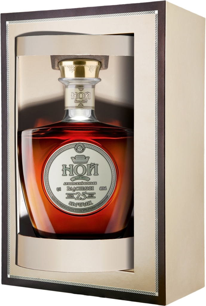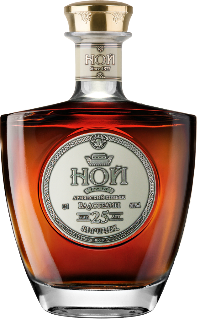 Изысканный, аристократичный коньяк "Ной Властелин" 25-летний — уникальный, элитный коньяк, сложность которого достигается путем сочетания в купаже не менее 25 старых коньячных спиртов, выдержанных как минимум 25 лет в бочках из кавказского дуба. "Ной Властелин" разливается в эксклюзивную оригинальную бутылку "Хеопс" (Heops), которая идеально подчеркивает качество этого изысканного коньяка. "Ной Властелин" 25-летний завоевал титул "Звезда Продэкспо-2004".