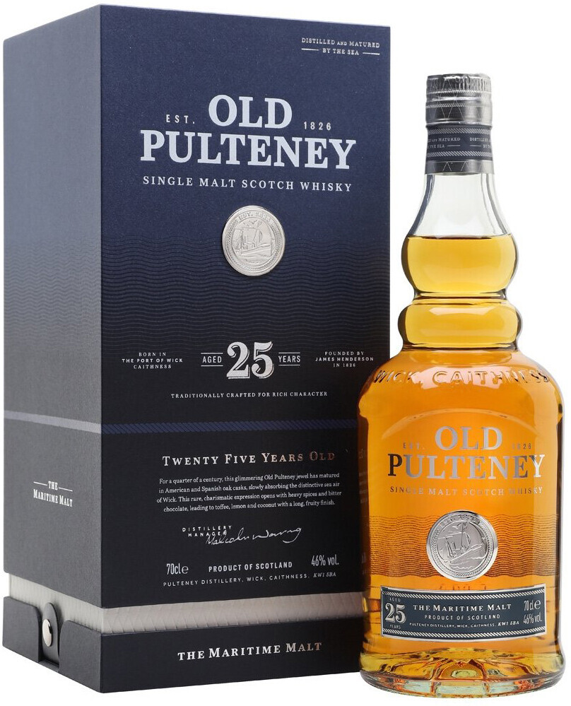 Односолодовый виски "Old Pulteney" 25 Years Old, выдержка которого составляет 25 лет, отличается мягкостью, округлостью и насыщенностью вкуса и аромата. Первые 22 года виски выдерживался в бочках из-под бурбона из американского дуба. Затем виски помещается на три года в бочки из испанского дуба, в которых ранее выдерживался херес олоросо. В виски сочетаются пряные и сладковатые оттенки, плотная текстура и солоноватые нотки морского бриза.