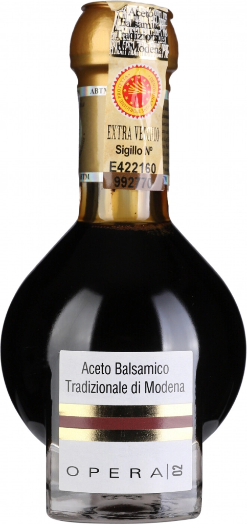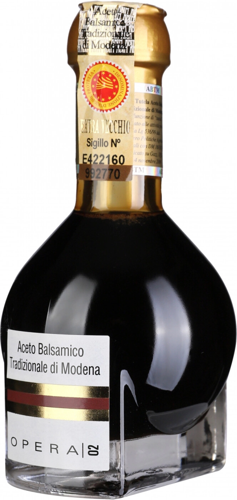 Opera 02, Aceto Balsamico Tradizionale di Modena, Extravecchio 25 Anni — традиционный бальзамический уксус из Модены, для производства которого в основном используют виноград сортов Треббьяно и Ламбруско, без добавления других веществ. Технология производства включает варку на прямом огне в котлах под открытым небом, естественную ферментацию и ацификацию приготовленного сусла. Далее следует медленная выдержка в течение 25 лет в бочках из различных ценных пород дерева под бдительным контролем производителя. За это время уксус приобретает правильный баланс между кислотностью и сладостью, обволакивающий сливочный, интенсивный и безошибочный вкус традиции. Точная технология — секрет, передаваемый на протяжении четырех поколений.