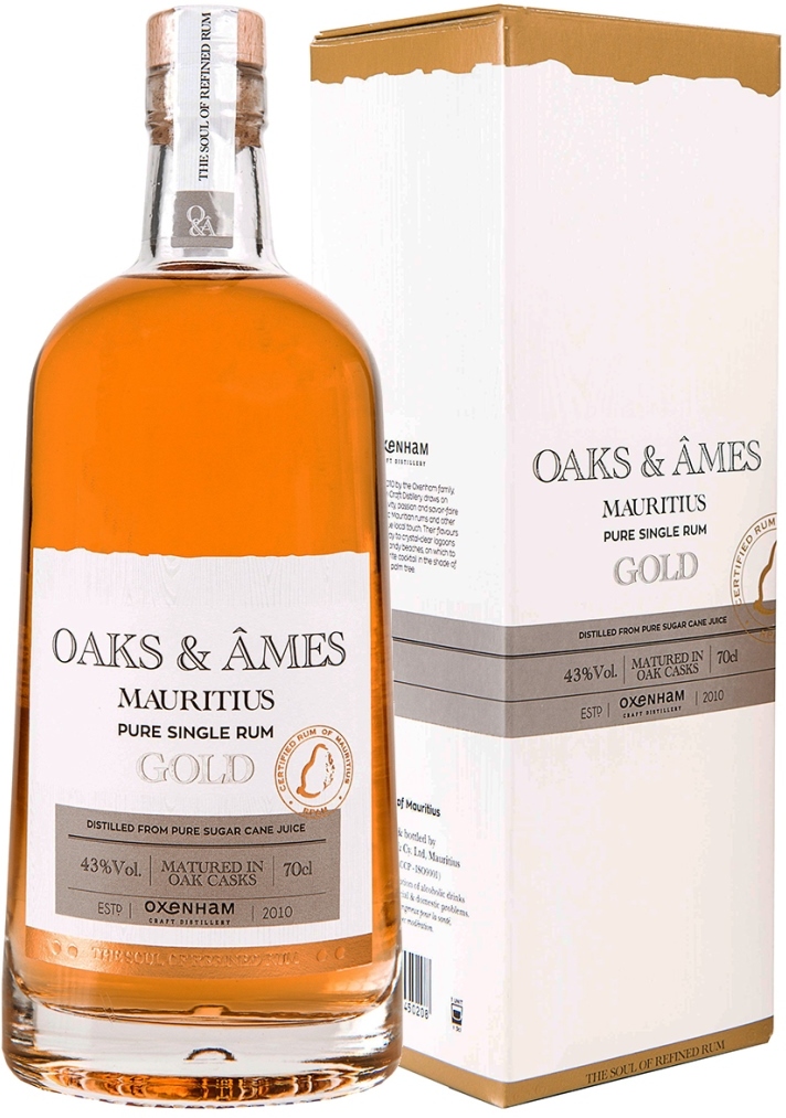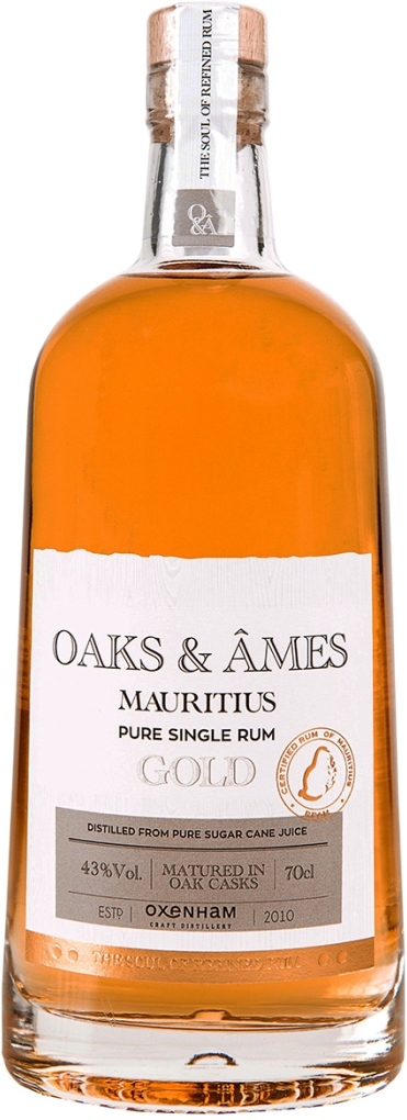 "Oaks & Ames" Pure Single Gold — золотой выдержанный ром премиального класса. Ром производится из лучшего тростникового сахара, выращенного на высокогорье острова Маврикий. Алкогольная ферментация сока первого отжима тростникового сахара проходит при низкой температуре и достаточно медленно (10-14 дней). Полученное тростниковое "вино" подвергается дистилляции в медных перегонных кубах. Затем ром выдерживается в комбинации трех типов дубовых бочек (из-под бурбона, из-под сотерна и новых) в течение минимум года.