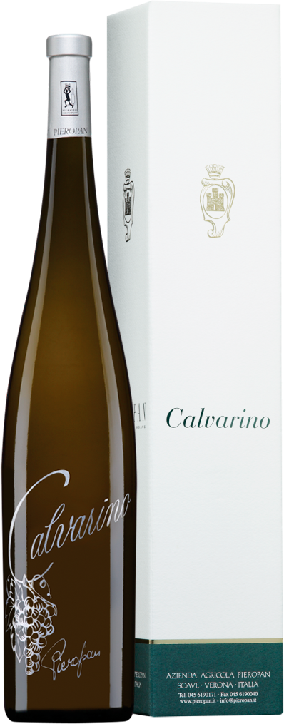 У белого вина "Calvarino" очень интересное название. Буквально, оно означает "маленькая Голгофа". Такое имя было выбрано из-за крутизны склона виноградника, на котором выращивается урожай для создания вина, и сложностей, связанных с его обработкой. У этого терруара типичные для Соаве черные вулканические почвы, хорошо поглощающие тепло. Используемый в купаже "Кальварино" виноград сорта Гарганега придает вину структуру и кислотность, а Треббьяно ди Соаве — богатство вкуса и аромата. После сбора ягоды прессуются и ферментируются при строгом контроле температуры. В отличии от большинства вин Пьеропан, "Кальварино" не выдерживается в дубовых бочках, вино созревает на осадке в больших бетонных баках. Кроме того, перед продажей, оно проводит минимум два месяца в бутылках.