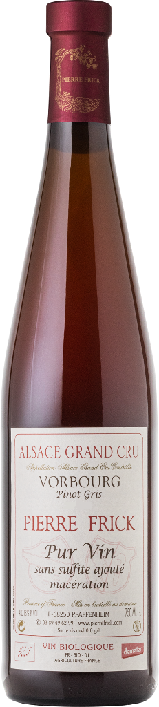 Pierre Frick, Vorbourg, Pinot Gris Maceration, Alsace Grand Cru — аутентичное, живое оранжевое вино из винограда сорта Пино Гри, отличающееся, как и все вина от Пьер Фрик, впечатляющим характером и высоким качеством в сочетании с бескомпромиссной натуральностью. Виноград выращивается органическими и биодинамическими методами на винограднике "Vorbourg" класса Гран Крю. "Vorbourg" является одним из самых южных Гран Крю, расположенных вдоль восточных склонов гор Вогезы. Его выгодная южная и юго-восточная экспозиция позволяет лозам нежиться в лучах мягкого раннего утреннего солнца. Почвы виноградника представлены преимущественно известняком и мергелем, нижние участки, находящиеся вблизи реки, включают глину и имеют тонкий покров из лесса. Особенности терруара наделяют вино сложным, минеральным характером в сочетании с изысканной утонченностью.