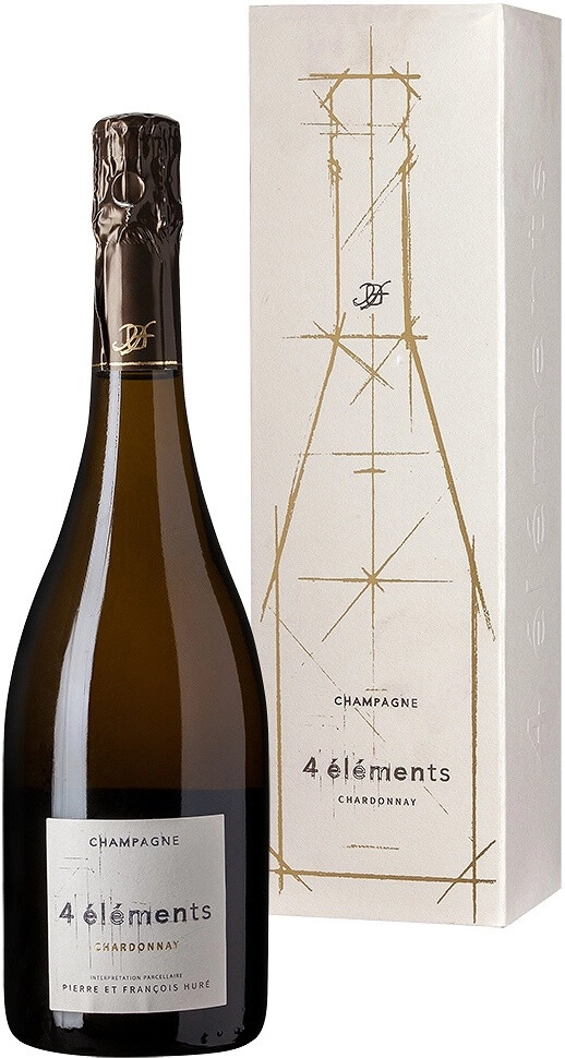 Champagne Hure Freres, "4 Elements" Chardonnay Extra Brut — роскошное, изысканное экстра-сухое шампанское, созданное из винограда сорта Шардоне, который произрастает на винограднике "Derrière Travent". Сбор урожая проводится вручную, на винодельне плоды подвергаются ферментации при контролируемой температуре в стальных емкостях. Выдерживается шампанское 7 месяцев в дубовых барриках и 4 года в бутылках в погребах винодельни. Потенциал шампанского составляет 5-15 лет.