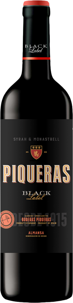 Piqueras, "Black Label", Almansa DO — это прекрасное вино из шелковистого сорта Сира и более плотного, фруктового сорта Монастрель. Виноград выращен на высокогорных участках методами органического земледелия. Сбор урожая начинают с 15 сентября. Виноград подвергают спонтанной ферментации на природных дрожжах с постепенным повышением температуры до 29 °С для получения насыщенного цвета. Затем температуру постепенно снижают до 23 °С. Выдерживают вино 4-6 месяцев в бочках из американского и французского дуба.