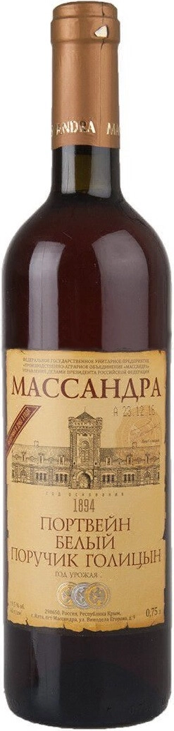 Массандра, Портвейн Белый Поручик Голицынобладает выразительным плодовым ароматом и насыщенным, гармоничным вкусом с оттенками миндаля. Этот напиток отличается необычно низким содержанием сахара (4,0 г/100 куб), вследствие чего его вкус напоминают знаменитый сухой портвейн Португалии. Портвейн, впервые выпущенный в 2006 году в честь 70-летия объединения "Массандра", создан из винограда сорта Ркацители, составляющего основу купажа, а также Алиготе, Кокур и других сортов, выращенных на собственных виноградниках хозяйства "Массандра". Своими отменными вкусовыми качествами портвейн обязан уникальным крымским условиям, которые характеризуются отсутствием перепада дневных и ночных температур, что позволяет винограду обрести полную зрелость с высоким содержанием сахара.