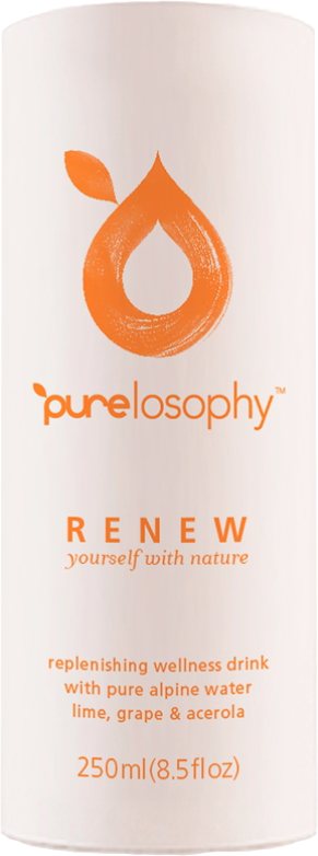 Purelosophy Renew (Пьюлософи Ренью) — очищающий напиток, который ускоряет мышечное восстановление после тренировки, снижает оксидативный стресс, а также употребляется при смене часовых поясов. В состав напитка входят только натуральные компоненты на основе растительных экстрактов (алое-вера, артишоки, одуванчик, куркума, фенхель, крапива, лайм и ацерола), а также натуральный виноградный сок из винограда, собранного в Бордо. Напиток не содержит сахара, глютена, E-добавок и консервантов. Всего одна баночка в день значительно уменьшит пагубное влияние свободных радикалов и загрязненной окружающей среды, а значит — очистит организм от вредных шлаков и токсинов.