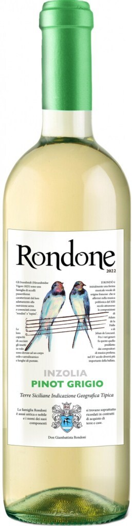 Rondone, Inzolia Pinot Grigio — свежее, изящное белое полусухое вино из солнечной Сицилии с приятными нотами фруктов во вкусе и аромате. Для его создания используют виноград сортов Инзолия и Пино Гриджио, выращенный на собственных виноградниках хозяйства Сеттесоли, которые расположены в коммуне Менфи, на юго-западе Сицилии. Сорт Инзолия отличителен тем, что даже в жарком климате сохраняет высокую кислотность. Пино Гриджио отличается свежестью и яркостью. Сбор урожая чаще всего проходит в ночные часы. Для сохранения свежести и фруктовости винификация осуществляется в стальных резервуарах.