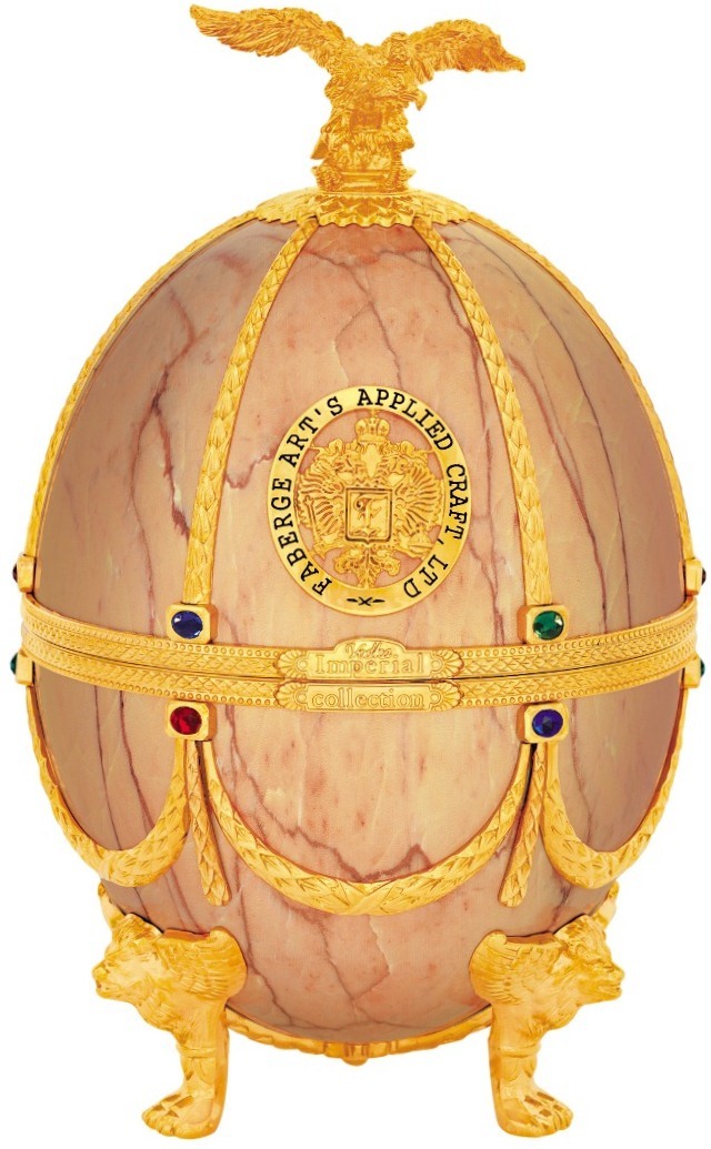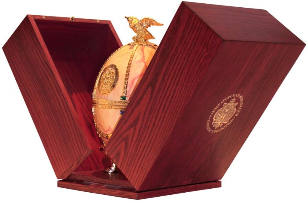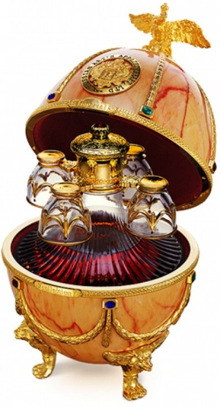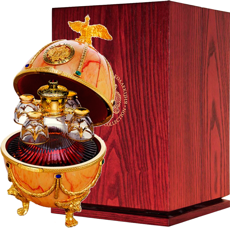 Яйцо Фаберже помещено в деревянную коробку, которая производится из красного дерева и облицовывается шпоном. Такой набор, несомненно, займет достойное место в коллекции истинного ценителя крепких напитков.