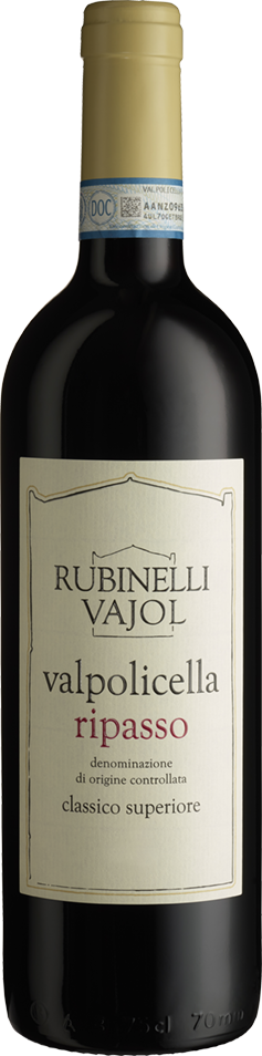 Rubinelli Vajol, Valpolicella Ripasso Сlassico Superiore — красное сухое вино из региона Венето, обладающее невероятной концентрацией фруктовых ароматов в сочетании с редкой элегантностью вкуса. Вино изготавливается из нескольких сортов винограда: Корвина, Корвиноне, Молинара, Рондинелла и Оселета — настоящих жемчужин итальянской винной культуры. Сорт Корвина играет главную роль в этом купаже, сообщая вину свежую кислотность, оттенки вишни и насыщенный рубиново-красный цвет. Рондинелла формирует тело вина и еще больше подчеркивает нежную пряность сорта Корвина. Остальные сорта гармонично дополняют композицию, добавляя богатства и глубины. Урожай собирается по достижении ягодами оптимальной спелости. Затем в течение месяца ягоды подсушиваются на солнце. После того, как в винограде увеличилась концентрация сахаров за счет потери более 40% объема, ягоды подвергаются мягкому прессованию в начале ноября. Мацерация и ферментация протекают при строго контролируемой температуре в течение 15-20 дней. Вино производится в соответствии с древней винодельческой техникой под названием "ripasso". В феврале в часть вина Вальполичелла, произведенного осенью, добавляются выжимки, оставленные после изготовления Амароне, "провоцирующие" повторное брожение. Этот процесс повышает уровень алкоголя, улучшает содержание и структуру вина, повышает долговечность, а также развивает новые ароматы, которые создают интересный и сложный букет. Повторное брожение длится 5-6 дней. Вино выдерживается в больших дубовых бочках в течение 24 месяцев.