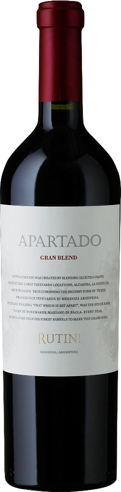 Rutini, "Apartado" Gran Blend — это захватывающее вино, вобравшее в себя виноград лучших участков трех районов долины Мендосы. Климат и почва должны идеально подходить каждому сорту, тогда виноград достигает максимальной выраженности сортовых характеристик и полной зрелости. Купаж "Apartado" Gran Blend был составлен из 30% Каберне Совиньон, 20% Каберне Фран, 30% Мальбек и 20% Сира. Виноград был собран вручную, прошел традиционную ферментацию. После окончания яблочно-молочного брожения вино выдерживается с течение 24 месяцев в дубовых бочках (50% — новые и 50% — вторичного использования).