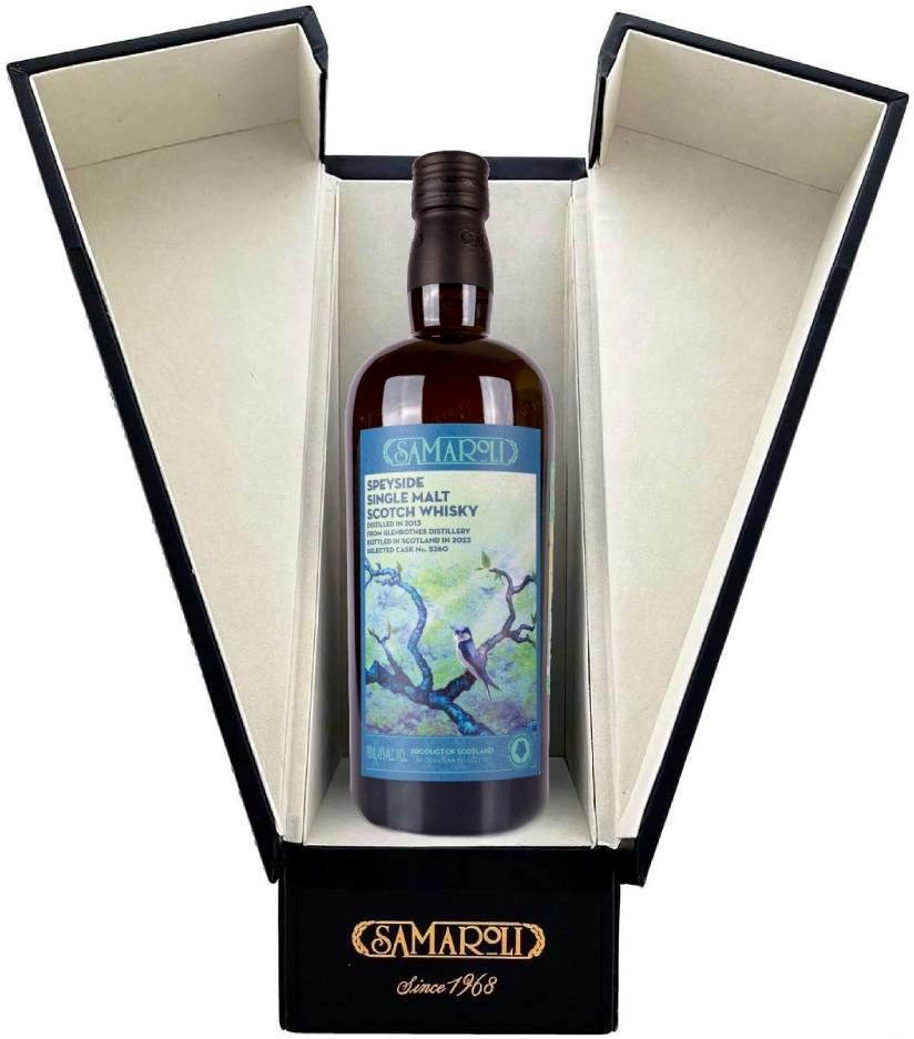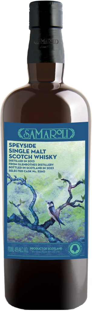 Samaroli, "Glenrothes" Speyside Single Malt, 2013 — односолодовый шотландский виски, дистиллированный 30 июня 2013 года на винокурне Glenrothes Distillery. Виски выдерживался долгих 10 лет в бочке из под бурбона под номером 5260 и был бутилирован при крепости 48% в количестве всего 450 бутылок 30 ноября 2023 года.