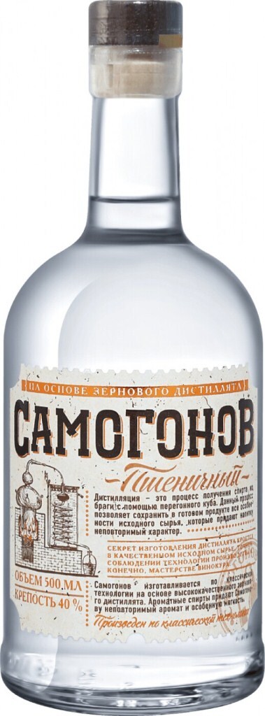 Самогонов" Пшеничный — крепкий спиртной напиток, изготовленный по классической технологии на основе высококачественного пшеничного дистиллята. Ароматный спирт мяты перечной и экстракт кожуры винограда придают напитку особую мягкость, свежесть и незабываемый аромат. Правильность проведения процедуры дистилляции гарантирует крепость, и, что самое главное — сохранение прекрасного аромата и вкуса исходного сырья, которое придает напитку неповторимый характер. Дистилляция протекает в медных перегонных кубах под строгим контролем винокура. Непосредственно перед розливом дистиллят разводится чистой водой до 40% содержания спирта. Высокое качество исходного сырья, точность соблюдения технологии производства, следование авторской рецептуре и профессионализм мастера-дистиллятора гарантируют непревзойденный результат. "Самогонов" Пшеничный обладает очень мягким вкусом и богатым, насыщенным ароматом, что характерно для домашнего самогона.