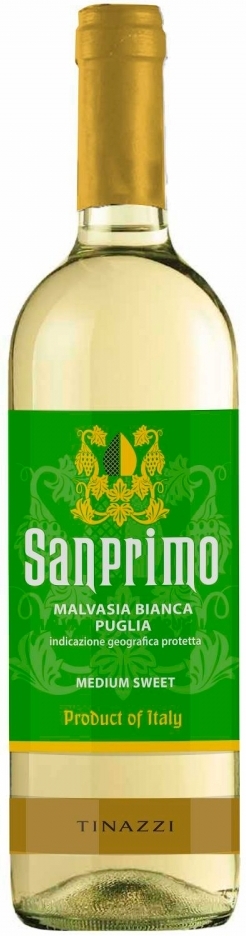 Sanprimo, Malvasia Bianca Medium Sweet, Puglia — легкое, летнее полусладкое вино. Приятная сладость гармонично сочетается со свежей кислотностью и тонкой минеральностью. По окончании сбора урожая ягоды подвергаются прессованию с последующей традиционной винификацией, проходящей со строгим температурным контролем в стальных резервуарах. Вино смело может подаваться как к пасте, сырам, закускам, так и к десертам, выпечке, мороженому, фруктам или ягодам.