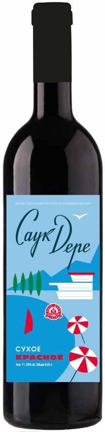 Красное сухое вино "Sauk-Dere" Red Dry принадлежит к линейке ассамбляжных вин хозяйства "Саук-Дере". Создается из красных сортов винограда, выращенных в регионе Саук-Дере (Крымский район Краснодарского края). Предгорный терруар и преобладающий здесь теплый солнечный климат способствуют выращиванию традиционных красных и белых сортов винограда, из которых создают достойные моносортовые и ассамбляжные вина. "Саук-Дере" красное сухое обладает ярким ароматом и сочным, слегка пряным вкусом. Оно хорошо сочетается с блюдами из красного и белого мяса. Этикетка вина выполнена в стиле рисунков 60-х гг. ХХ века, ее игривый, морской дизайн напоминает об отдыхе на Черноморском побережье.