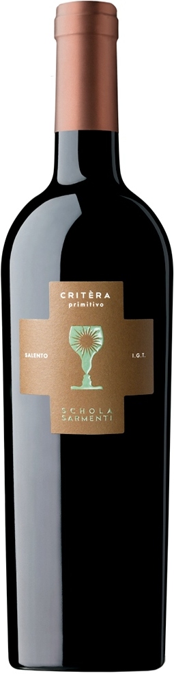 Schola Sarmenti, Critera, Primitivo — удивительно мощное, богатое, сильное по характеру красное сухое вино, изготовленное из винограда сорта Примитиво, который созревает на глинисто-известковых почвах в Саленто. Саленто — полуостров на "пятке" итальянского сапога между Адриатическим и Ионическим морями. Два моря с их постоянными свежими бризами обеспечивают достаточное охлаждение виноградных лоз. Это позволяет винограду созревать удивительно медленно и накапливать душистый аромат. Средний возраст лоз составляет 25 лет. Сбор урожая осуществляется вручную по достижении ягодами оптимального уровня спелости. На винодельне плоды подвергаются низкотемпературной предферментационной мацерации и ферментации в резервуарах из нержавеющей стали при температуре 20-22°C в течение 15 дней. Постферментационная мацерация длится 5 дней. Яблочно-молочное брожение и выдержка вина на протяжении 18 месяцев месяцев проходят в тех же стальных емкостях. После бутилирования вино еще 6 месяцев "отдыхает" в бутылках в погребах винодельни.