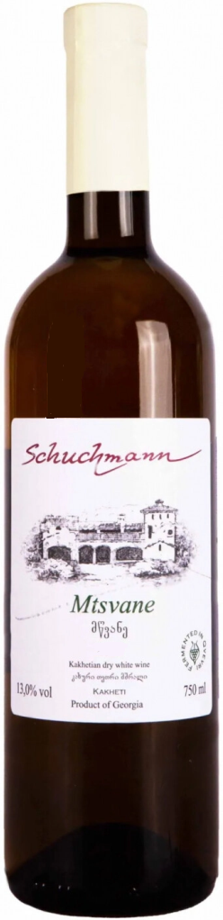 Сложное, необычное, поражающее сочетанием силы и мягкости, изысканности и экстравагантности, белое сухое вино Schuchmann, Mtsvane Kakhetian является ярким воплощением грузинского гостеприимства, жизнелюбия и немецкого качества. Вино производится винодельней ультра-премиум-класса Schuchmann, специализирующейся на традиционных грузинских сортах винограда. Виноградники винодельни расположены в селах Напареули, Кисисхеви и Шилда в Кахетии, одном из старейших и лучших винодельческих регионов мира. Здесь, недалеко от города Телави, у подножия великого Кавказа, на темных плодородных почвах выращиваются виноградные лозы, самые старые из которых были посажены в 1986 году.