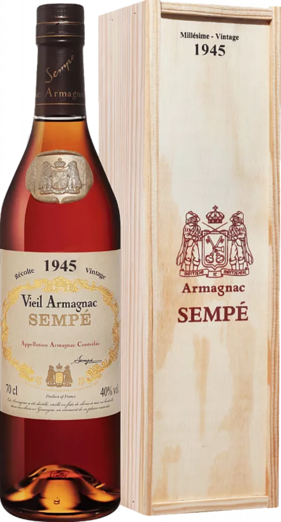 Sempe, Vieil Armagnac, Vintage 1945 — роскошный арманьяк, изготовленный из дистиллятов разных сортов белого винограда и выдержанный в бочках из гасконского дуба. Арманьяк не подвергается энологической обработке. Дата розлива каждого винтажа определяется индивидуально работником погреба. На этом этапе он смешивает несколько видов арманьяка различного срока выдержки и способа изготовления.