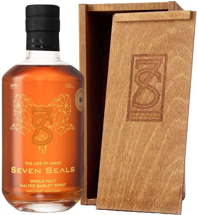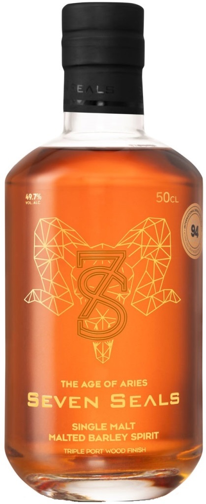 Seven Seals, Zodiac, The Age of Aries, Single Malt — односолодовый виски крепостью 49,7%, который производится по уникальной технологии Штокхаузена. Изобретатель, доктор Дольф Штокхаузен, именем которого назван метод, полностью изменил процесс старения виски и сократил его на годы. Его идея основана на физическом законе, имитирующем выдержку в бочке. В 2017 году, после многих лет исследований, Дольф Штокхаузен разработал устойчивый процесс и добился мировой сенсации своим изобретением. Данный метод предусматривает распил бочки на щепки с последующим добавлением этих щепок в дистиллят. Такой способ позволяет древесине контактировать с дистиллятом и насыщать виски в 6 раз быстрее по сравнению с традиционной выдержкой в бочках. Для выдержки виски "Seven Seals" Zodiac The Age of Aries Single Malt использовались бочки из-под портвейна.