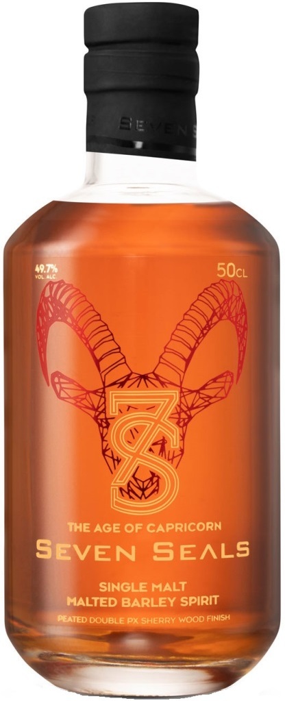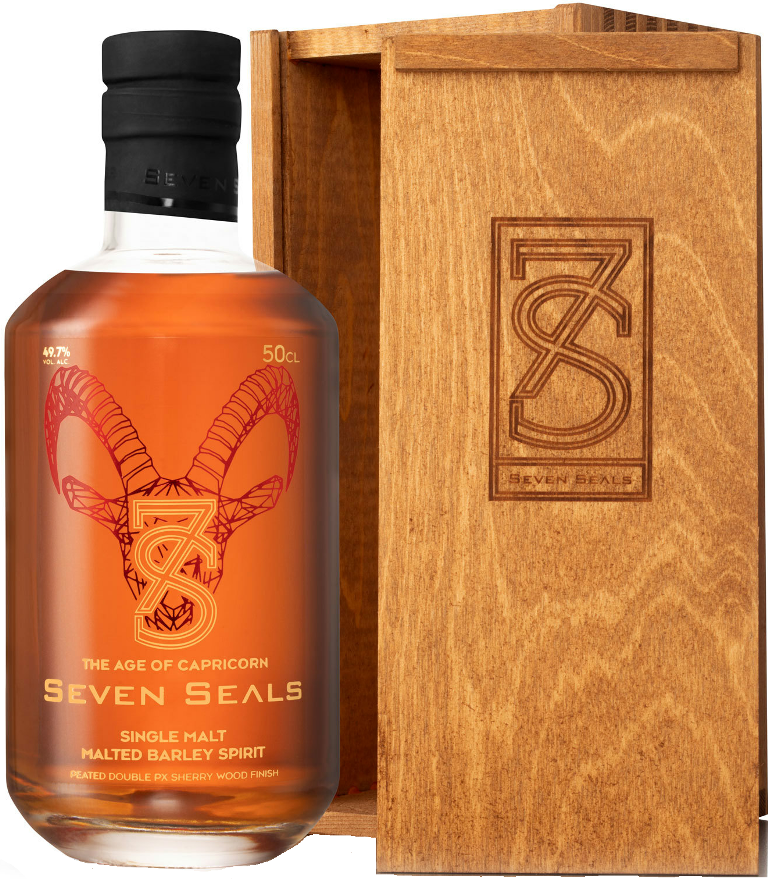 Seven Seals, Zodiac, The Age of Capricorn, Single Malt — односолодовый виски крепостью 49,7%, который производится по уникальной технологии Штокхаузена. Изобретатель, доктор Дольф Штокхаузен, именем которого назван метод, полностью изменил процесс старения виски и сократил его на годы. Его идея основана на физическом законе, имитирующем выдержку в бочке. В 2017 году, после многих лет исследований, Дольф Штокхаузен разработал устойчивый процесс и добился мировой сенсации своим изобретением. Данный метод предусматривает распил бочки на щепки с последующим добавлением этих щепок в дистиллят. Такой способ позволяет древесине контактировать с дистиллятом и насыщать виски в 6 раз быстрее по сравнению с традиционной выдержкой в бочках. Для выдержки виски "Seven Seals" Zodiac The Age of Capricorn Single Malt использовались бочки из-под хереса Педро Хименес.