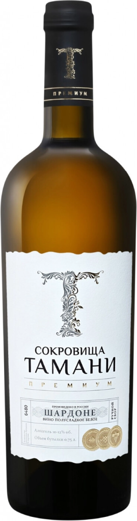Сокровища Тамани, Премиум Шардоне — белое полусладкое вино, для изготовления которого используют виноград сорта Шардоне и концентрированное виноградное сусло. Вина из Шардоне отличаются элегантностью и утонченностью. Благодаря ярким органолептическим характеристикам, этот сорт завоевал широкое признание у российских виноделов. Урожай собирается исключительно вручную. Процесс винификации протекает по традиционному методу производства белых вин с принудительной остановкой брожения, когда содержание остаточного сахара достигает 30-40 г/л. Вино отлично гармонирует с рыбой на гриле и морепродуктами, легкими закусками, фруктами и десертами.