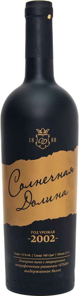 Солнечная Долина, Белое выдержанное — сбалансированное и гармоничное ликерное вино из винограда сортов Кокур, Сары Пандас, Кок Пандас, Мускат, Пино Серый, Солнечнодолинский и других. Средний возраст виноградных лоз — 30-35 лет. Удивительно глубокий и роскошный букет вина обязан своими характеристиками продолжительной выдержке. После завершения брожения вино подвергают созреванию в дубовых бочках как минимум 2-3 года. Выдержка в бутылках длится 14 лет. Релиз 2002 года весьма ограничен и представлен в сувенирных бутылках из матового стекла.
