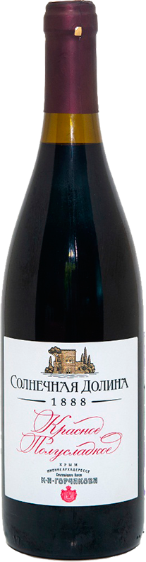 Солнечная Долина, Красное полусладкое — ординарное столовое полусладкое вино, выпускающееся с 2006 года. Вино характеризуется благородным вкусом без приторной сладости. Интересный купаж вина состоит из винограда сортов Бастардо Магарачский, Каберне Совиньон и Одесский Черный. Международный сорт Каберне Совиньон, привезенный в Солнечную Долину из Франции в 2001 году, дает вину хорошую структуру, оттенки ягод и цветов в аромате. Бастардо Магарачский, являющийся результатом скрещивания сортов Бастардо и Саперави, наполняет вино выразительным ароматом с тонами сафьяна и кофе. Сорт Одесский Черный, выведенный в Украинском НИИ виноградарства и виноделия им. Таирова путем скрещивания Аликанте Буше и Каберне Совиньон, придает вину сочный окрас и шоколадный аромат, а вкус делает мягким и гармоничным.