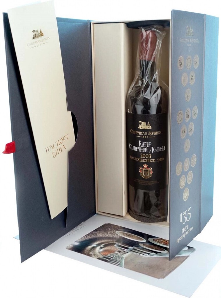 Кагор Солнечной Долины, 2003 — винтажное коллекционное ликерное вино, созданное из крымских сортов винограда 2003 года урожая. Виноград был выращен и собран на солнечных плантациях Крыма, принадлежащих хозяйству Солнечная Долина. Вино было создано по классической для ликерных вин технологии методом неполного сбраживания с нагревом виноградной мезги. Доведение до необходимых характеристик крепости и сладости осуществлялось путем добавления спирта высшей очистки. Далее вино выдерживалось в стальных чанах и бутылках после розлива, что сформировало его глубокий и многогранный характер. Попробуйте само время на вкус с винтажом 2003 года! Вино выпускается в презентабельной подарочной коробке, внутри которой можно найти также паспорт вина. "Кагор Солнечной Долины" был выбран для церковных богослужений и поставляется в епархии России.