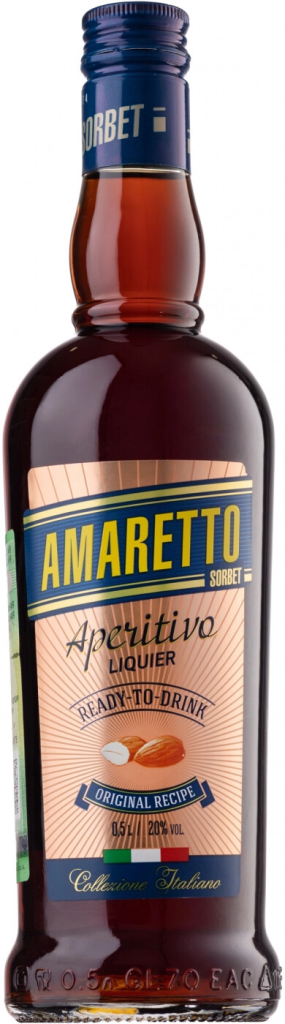 Sorbet, Aperitivo Amaretto — оригинальный десертный ликер из "Итальянской коллекции", изготовленный по оригинальному рецепту. Во вкусе и аромате ликера преобладают характерные для Амаретто миндальные нотки. Аперитив придется по вкусу не только женщинам, но и мужчинам. Напиток прекрасно сочетается с десертами, особенно миндальными и шоколадными, и мороженым, подойдет для создания коктейлей.