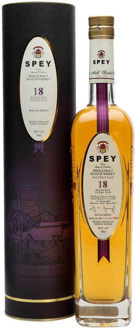 Односолодовый виски "Spey" 18 Years Old производится из тщательно отобранных спиртов. Благодаря выдержке на протяжении 18 лет в старых бочках из-под хереса, виски приобретает бархатистый, мягкий вкус и чарующий аромат. Всего было выпущено 1500 бутылок "Spey" 18 Years Old, каждая пронумерована.