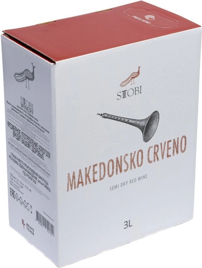 Stobi, Makedonsko Crveno — полусухое красное столовое вино, прекрасный экземпляр македонских автохтонных вин. Вино не предназначено для длительного хранения, пьется молодым, рекомендуется подавать охлажденным к мясным блюдам, сырам или сухому бисквитному печенью.