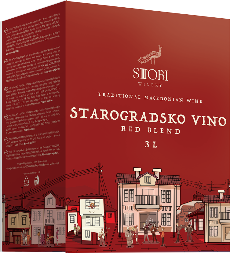 Stobi, Starogradsko, Red Blend — питкое и свежее красное полусухое вино из автохтонных сортов винограда Вранац и Прокупац, выращенных на собственных виноградниках компании. После сбора урожая, который осуществляется в момент оптимальной спелости ягод, виноград подвергается традиционной винификации при контролируемой температуре. Брожение принудительно останавливается путем резкого снижения температуры для сохранения тонкой естественной сладости. Вино лучше всего подавать при температуре 16-18°C к мясным блюдам, сырам, барбекю, также оно станет отличным выбором для пикника.