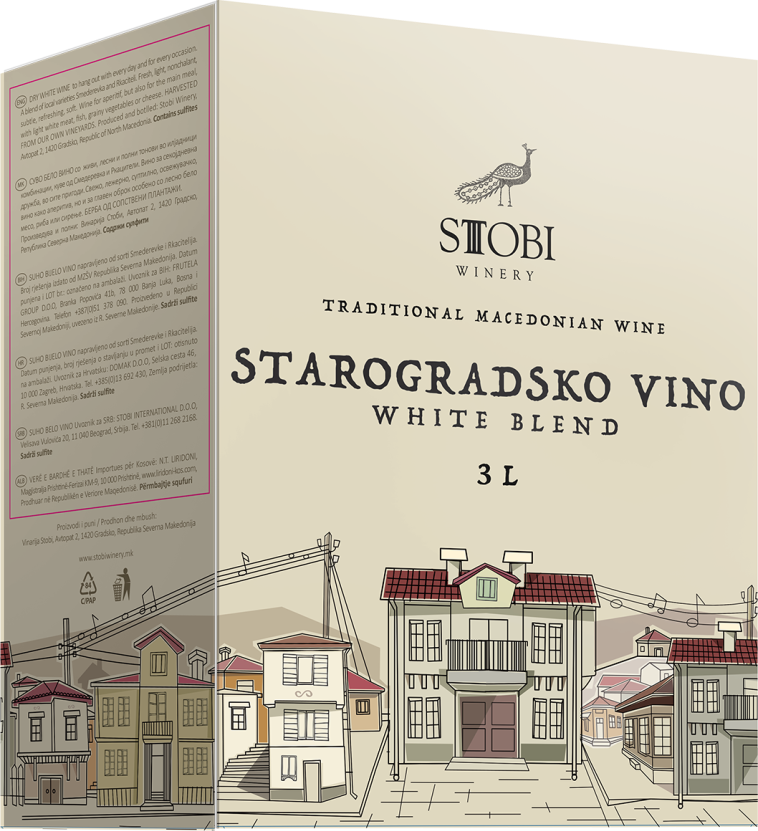 Stobi, Starogradsko, White Blend — питкое и свежее белое сухое вино из автохтонных сортов винограда Смедеревка и Жилавка, выращенных на собственных виноградниках компании. После сбора урожая, который осуществляется в момент оптимальной спелости ягод, виноград подвергается традиционной винификации при контролируемой температуре. Вино лучше всего подавать при температуре 8-10°C в качестве аперитива, к холодным закускам, зеленым салатам, рыбе на гриле, также оно станет отличным выбором для пикника.