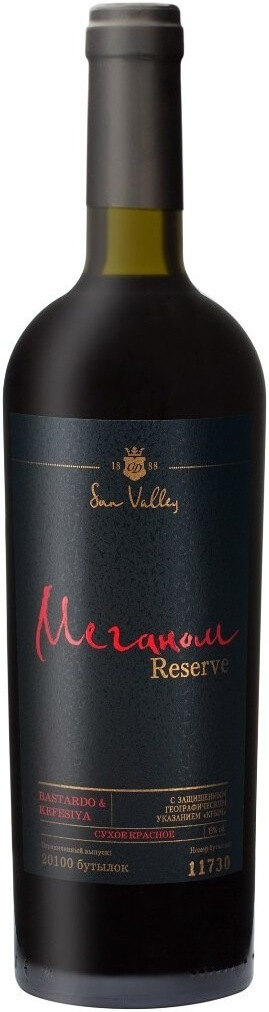 Меганом Резерв — сухое красное выдержанное вино с защищенным географическим указанием "Крым". Вино изготовлено из винограда сортов Бастардо Магарачский и Кефесия. Средний возраст виноградных лоз — 30-35 лет. Кефесия дарит вину плотный рубиновый цвет, наполняет вкус оттенками ягод и пряностей, а аромат — нюансами выдержки сафьяна и кофе. Бастардо Магарачский, являющийся результатом скрещивания сортов Бастардо и Саперави, дарует вину насыщенный, гармоничный вкус. Красное вино "Меганом" обладает особенным стилем и уникальными характеристиками. Кроме того, это вино отличается сильными антиоксидантными свойствами. Изящная терпкость и долгое бархатистое послевкусие "Меганом" Резерв делает его поистине выдающимся творением виноделов "Солнечной Долины". Вино выдерживается в дубовых барриках не менее 1 года.
