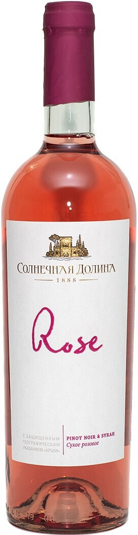 Солнечная Долина, Розе — новинка винодельни "Солнечная Долина" 2017 года. Это пленительное розовое сухое вино изготовлено по "белому" методу из взятого в равных пропорциях винограда сортов Сира и Пино Нуар. Чтобы получить такое вино с нарядным цветом, который специалисты винодельни поэтично назвали "нежный розовый персик", очень долго подбиралось соотношение сортов и разрабатывался технологический процесс. В лабораторных условиях был сделан не один десяток купажей. Необычный сортовой состав, сочетающий сорта французского юга (Сира) и севера (Пино Нуар), определил его особенный, индивидуальный характер. Вино станет отличным сопровождением дружеских посиделок, морского пикника или небольшого застолья.