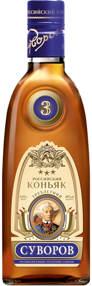 Коньяк "Суворов" 3-летний производится из виноградных спиртов, полученных из белых сортов винограда, выращенных в России. Коньяк получил свое название в честь прославленного русского полководца — Александра Васильевича Суворова. Спирты, входящие в купаж, выдерживались в дубовых бочках не менее 3-х лет. Напиток обладает приятным золотистым цветом, тонким ароматом с нотами смолы и цветов и мягким, гармоничным вкусом. Коньяк "Суворов" рекомендуется употреблять в качестве дижестива, в сочетании с кофе или в составе коктейлей.