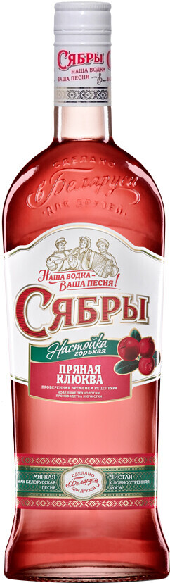 Настойка горькая "Сябры" Пряная клюква обладает особой привлекательностью благодаря ярко выраженным ягодным оттенкам. Помимо спирта класса "Люкс" в рецепт входят ароматные настои клюквы, корочки лимона, мускатного ореха и натуральный мед. Особенно стоит отметить яркий национальный колорит как в оформлении, так и во вкусе напитка.