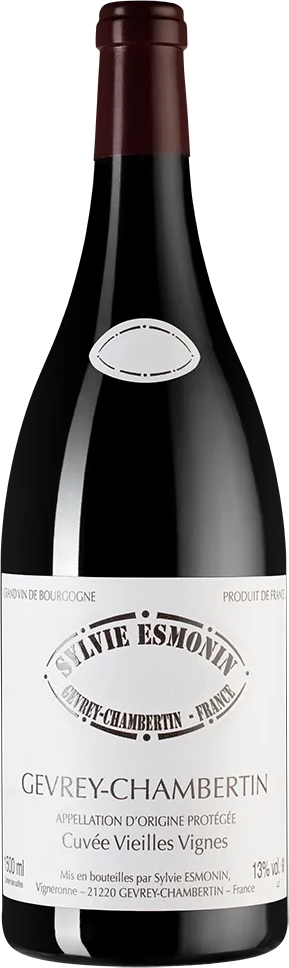 Sylvie Esmonin, Gevrey‐Chambertin "Vieilles Vignes" — роскошное красное сухое вино, которое изготовлено из винограда сорта Пино Нуар. Ягоды произрастают на виноградниках с мергелевыми почвами, возраст виноградных лоз составляет 60 лет. Сбор урожая осуществляется вручную в момент оптимальной спелости, на винодельне плоды подвергаются частичному гребнеотделению с последующей холодной мацерацией в открытых деревянных чанах в течение 2-6 дней. Ферментация с добавлением природных дрожжей длится 2 недели и проходит при контролируемой температуре 30-32°С. Малолактическая ферментация проводится в дубовых барриках. Выдерживается вино в дубовых бочках на протяжении 10-12 месяцев, 20% бочек являются новыми.
