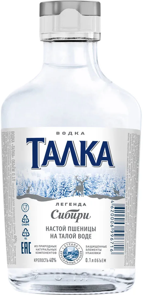 Водка "Талка" — настоящая сибирская водка, дышащая кристальной чистотой. Для ее производства используют только отборную пшеницу, настоянную на чистейшей ледниковой талой воде. Водка изготавливается из зернового спирта класса "Люкс" по запатентованной технологии смешивания воды и спирта и проходит фильтрацию серебром. "Талка" создана под стать красоте сибирской природы — чистая, строгая, настоящая.