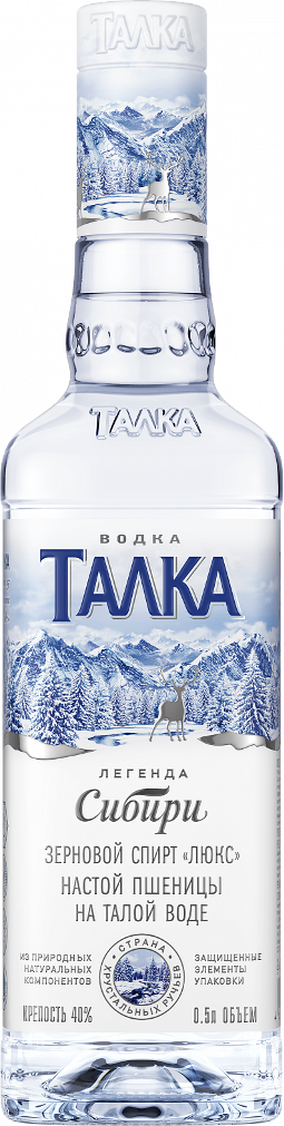 Водка "Талка" — настоящая сибирская водка, дышащая кристальной чистотой. Для ее производства используют только отборную пшеницу, настоянную на чистейшей ледниковой талой воде. Водка изготавливается из зернового спирта класса "Люкс" по запатентованной технологии смешивания воды и спирта и проходит фильтрацию серебром. "Талка" создана под стать красоте сибирской природы — чистая, строгая, настоящая.