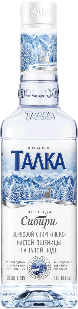 Водка "Талка" — настоящая сибирская водка, дышащая кристальной чистотой. Для ее производства используют только отборную пшеницу, настоянную на чистейшей ледниковой талой воде. Водка изготавливается из зернового спирта класса "Люкс" по запатентованной технологии смешивания воды и спирта и проходит фильтрацию серебром. "Талка" создана под стать красоте сибирской природы — чистая, строгая, настоящая.