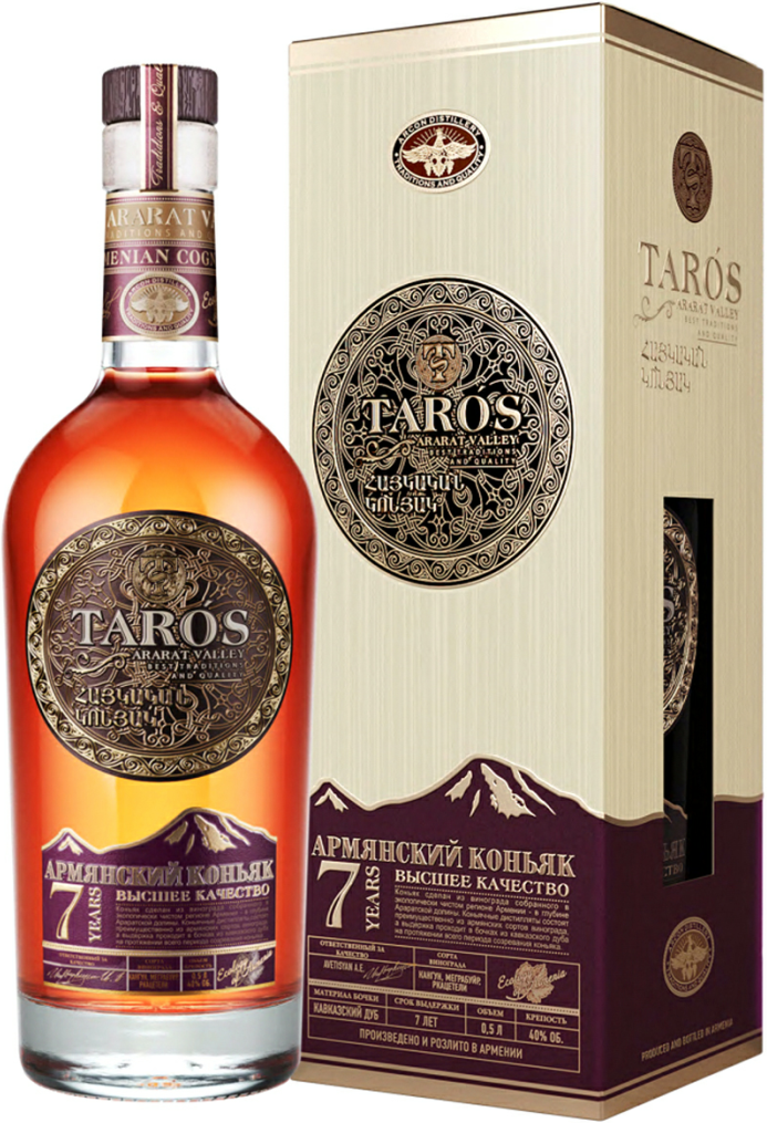 Taros, 7 Years Old — армянский выдержанный коньяк безупречно высокого качества, изготовленный по классической технологии. В его производстве используются коньячные спирты, которые были созданы из винограда сортов Кангун, Меграбуйр и Ркацители, выращенного в благоприятных климатических условиях Араратской долины. Коньячные дистилляты выдерживаются в бочках из кавказского дуба в течение не менее 5 лет. Авторский купаж технолога Армена Аветисяна, талантливого профессионала и потомственного винодела, придает напитку уникальный стиль.