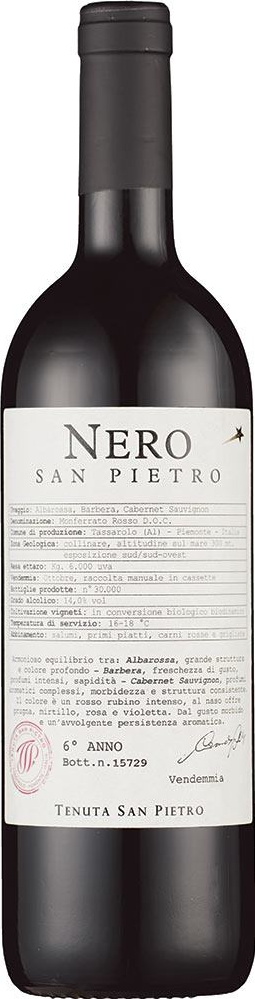 Tenuta San Pietro, San Pietro, Nero, Monferrato Rosso — итальянское красное полусухое вино, изготавливаемое из винограда сортов Альбаросса, Барбера и Каберне Совиньон, различные характеристики которых объединяются в гармоничном балансе ароматических и вкусовых ощущений. Виноград выращивают с применением методов органического и биодинамического земледелия в холмистой местности на высоте 300 метров над уровнем моря. Почвы виноградников — глинисто-известняковые, с отличной текстурой и оптимальным содержанием минералов. Виноград собирают вручную, как правило, в октябре в корзины по 20 кг. На винодельне его подвергают гребнеотделению и мягкому прессованию. Полученное сусло ферментируется в контакте с кожицей в чанах из нержавеющей стали при строгом контроле температуры в течение не менее 15 дней. Этот процесс сопровождается регулярной перекачкой сусла для извлечения цвета и аромата. По завершении яблочно-молочного брожения вино выдерживается на осадке около года в стальных чанах. Потенциал вина составляет 6-8 лет.
