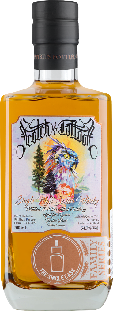 The Single Cask, "Scotch & Tattoos" Blair Athol Cask №303305, 13 Years Old — односолодовый виски, обладающий щедрым ароматом и насыщенным вкусом. Спирты были дистиллированы на винокурне Блэр Атол 14 апреля 2008 года, а выдержка в течение 13 лет проходила в хогсхеде №303305. Бутилирование при бочковой крепости 54,7% прошло 14 февраля 2022 года. Виски прекрасен в чистом виде в качестве дижестива, а также с добавлением воды, льда или в составе коктейлей. Всего было выпущено 124 бутылок виски, каждая бутылка пронумерована.